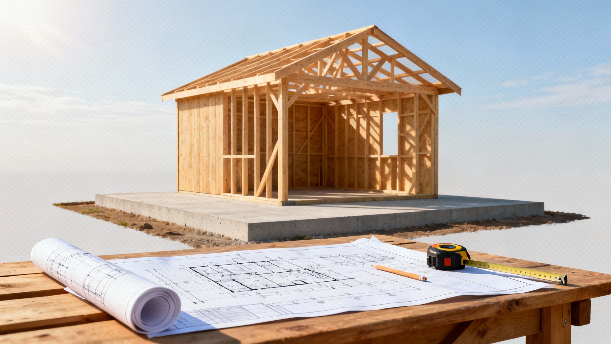 Byggeplaner for et skur med tegninger, træ, tagsten, skruer og målebånd på et træbord.