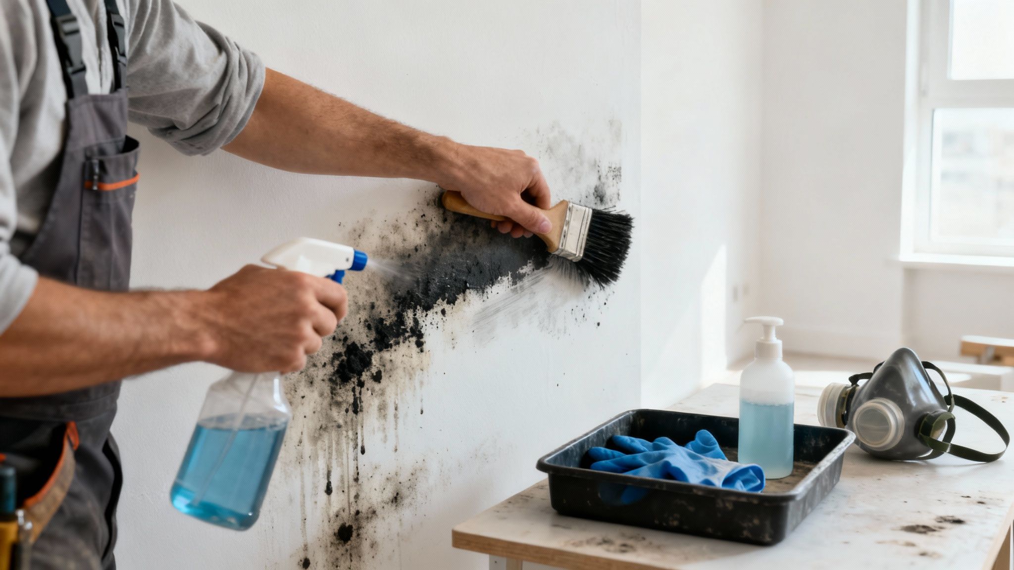 Du starter med at fjerne så meget synlig skimmel, du overhovedet kan. Grib en børste eller en grov svamp og en spand med helt almindeligt sæbevand (vand og universalrengøring). Målet er simpelthen at fjerne selve svampevæksten og det snavs, den lever af. Et godt tip er at gøre området let fugtigt, før du begynder at skrubbe – det binder sporerne og minimerer, hvor mange der hvirvler op i luften.