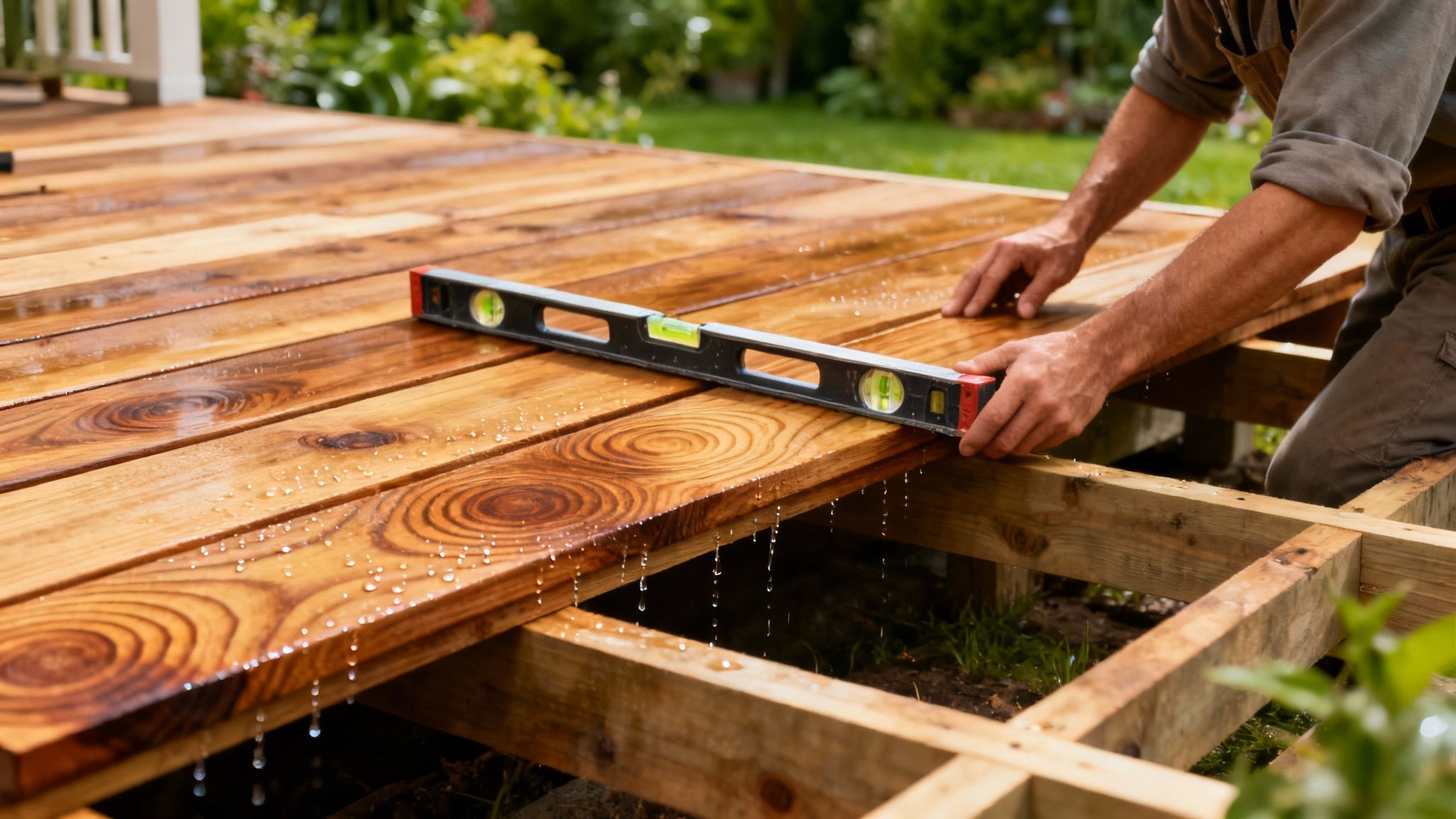 En tømrer i færd med at montere nye terrassebrædder