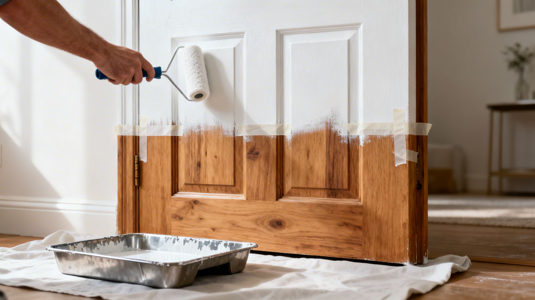 En lille malerrulle (10-15 cm): Find en rulle med korte, tætte fibre, der er lavet til glatte overflader. Den er guld værd til de store, flade paneler på døren, da den fordeler malingen hurtigt og ensartet. Resultatet er en fin, let struktureret overflade helt uden penselstrøg.