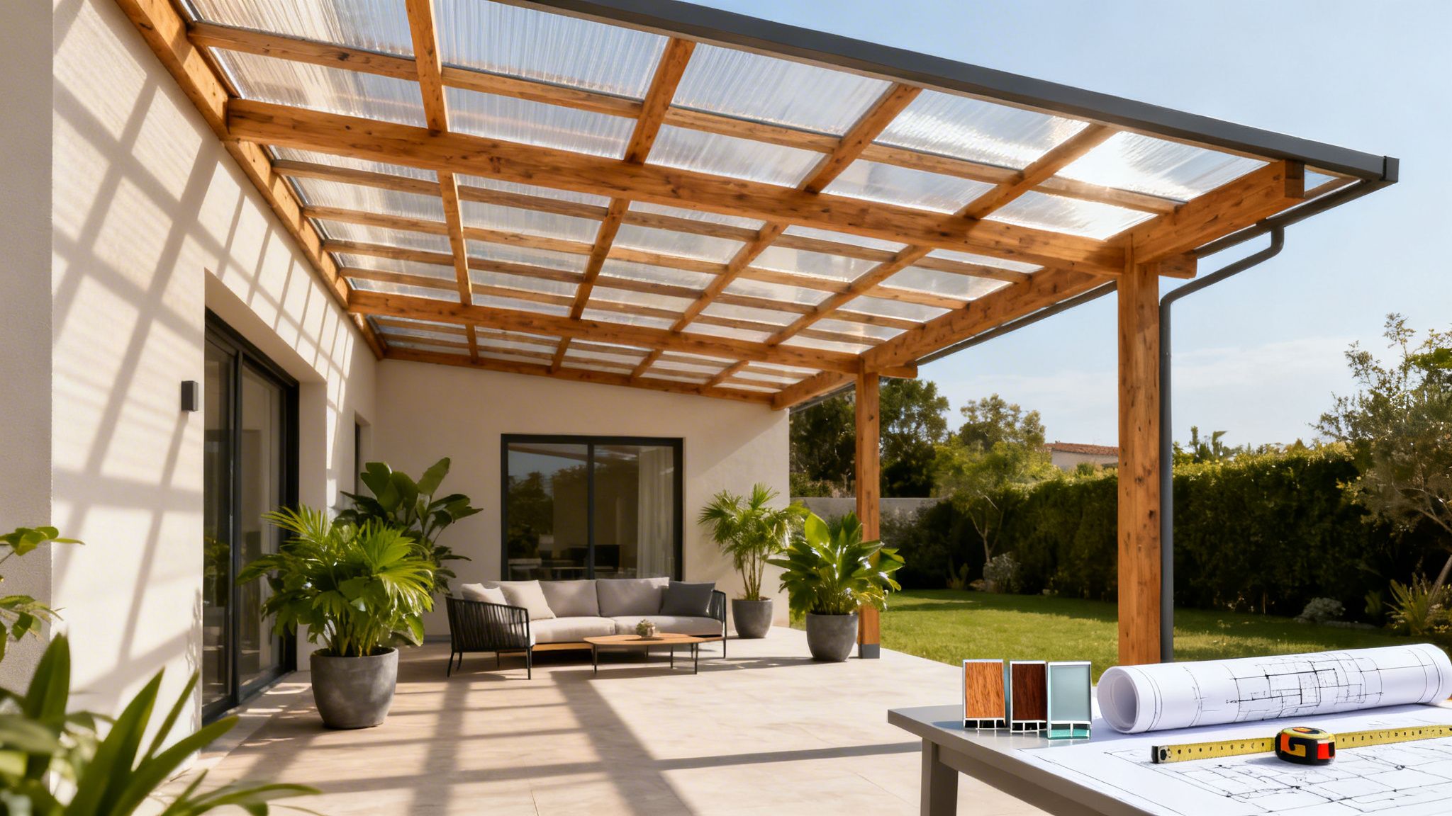 Forskellige materialer til en overdækket terrasse, herunder træ, glas, polycarbonat og aluminium.