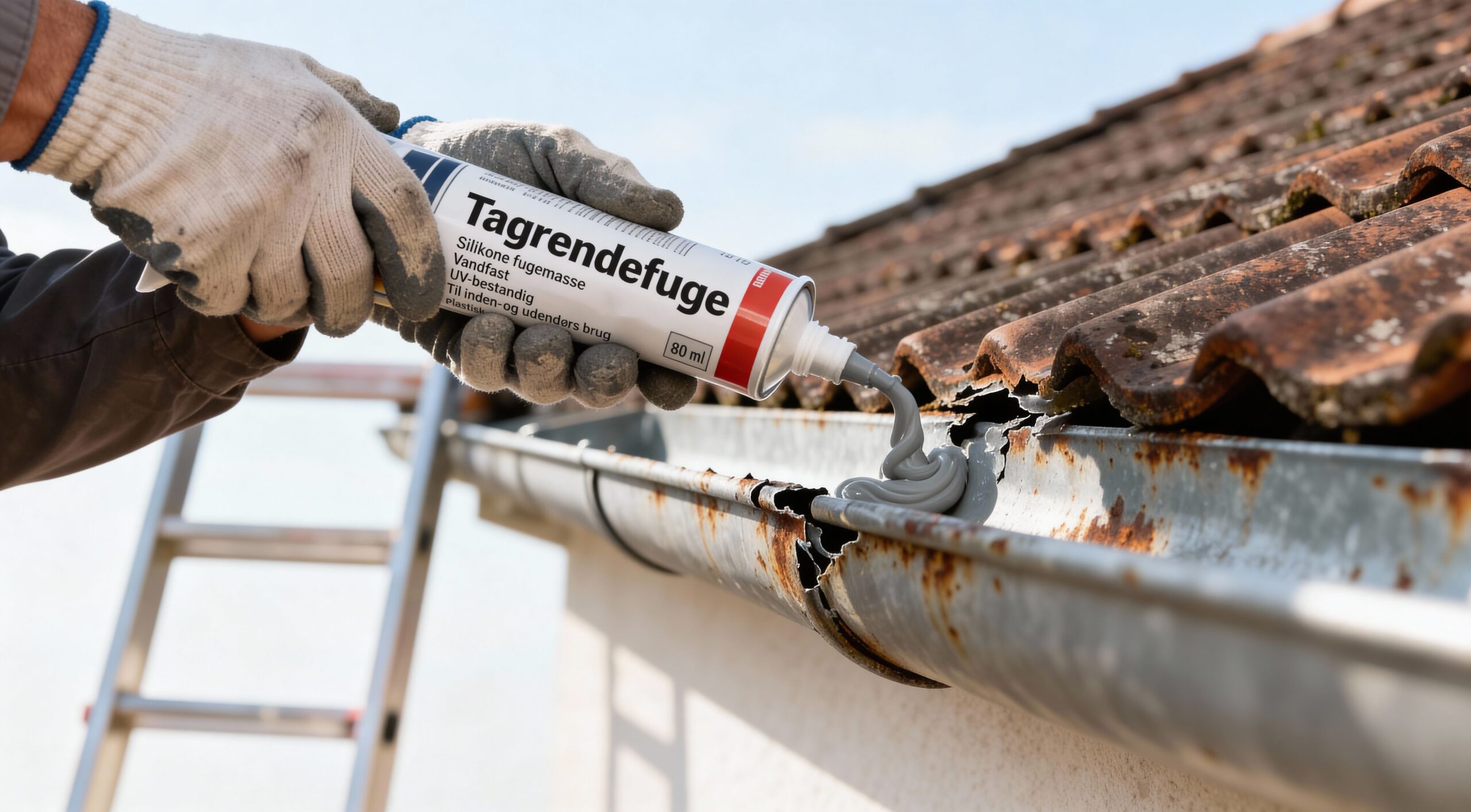 - Tagrendefuge eller silikone: Helt perfekt til smårevner eller samlinger, der er begyndt at give sig. Gå efter en fugemasse, der er lavet til udendørs brug og kan klare store temperaturudsving. Dens fleksibilitet gør, at den kan følge tagrendens bevægelser, når metallet udvider sig og trækker sig sammen.