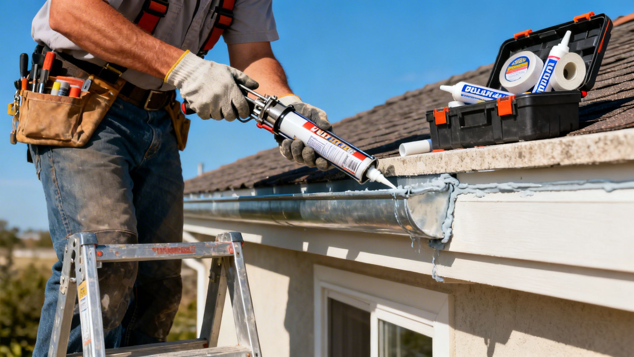 En person tætner en tagrende ved et bølgepap tag med fugemasse og spartel.