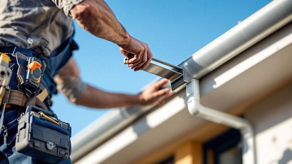 Når de gamle render er væk, kommer vi til det allervigtigste skridt: montering af rendejern med det rigtige fald. Faldet er altafgørende, for det er dét, der får regnvandet til at løbe aktivt mod nedløbsrøret i stedet for at blive stående. Stillestående vand er tagrendens værste fjende.